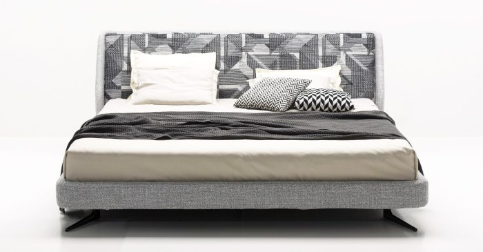 Контрасты нарушают привычное движение мысли. Нежный велюр у изголовья и более грубая рогожка основной обивки – это тактильная игра, которая возможна только здесь.