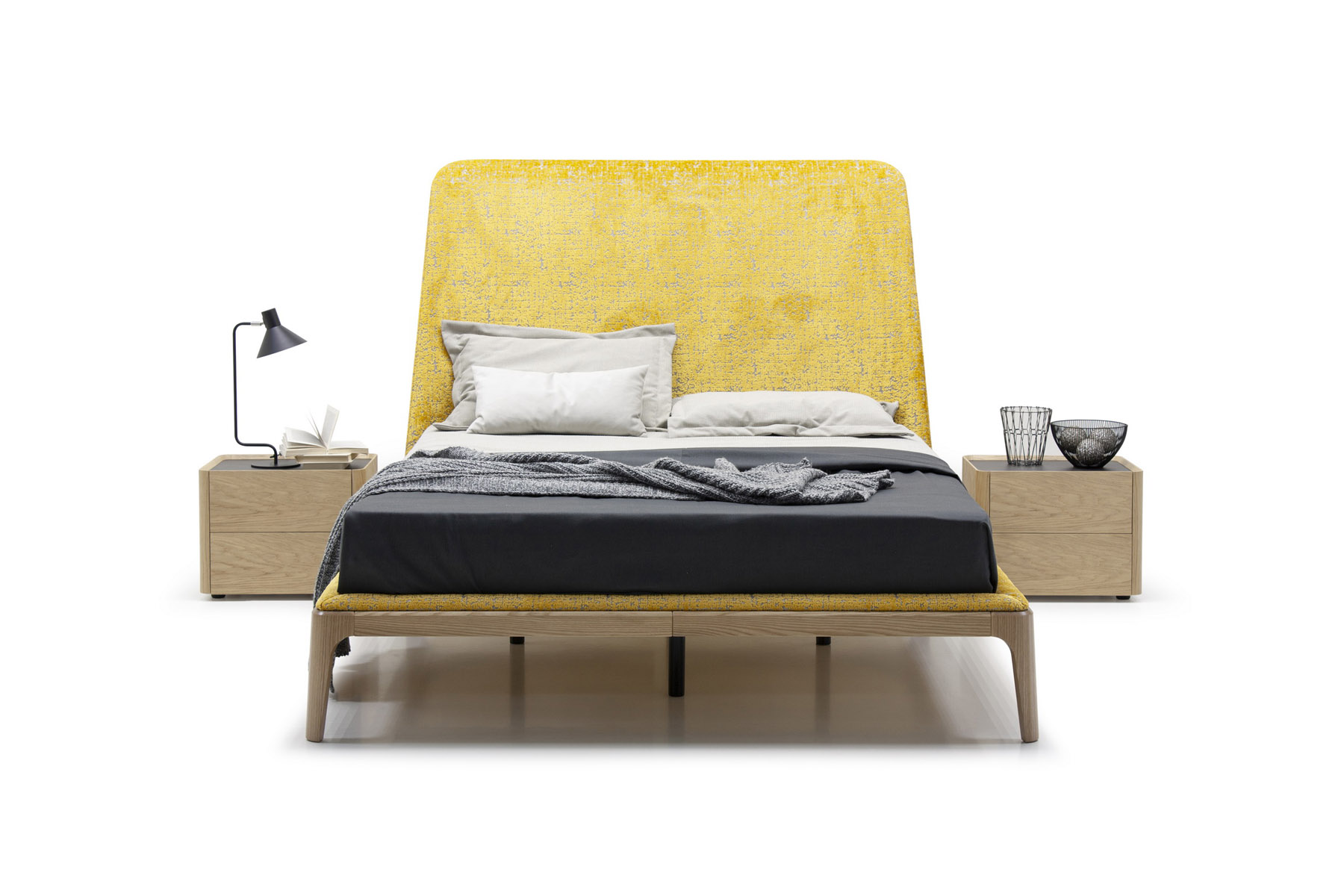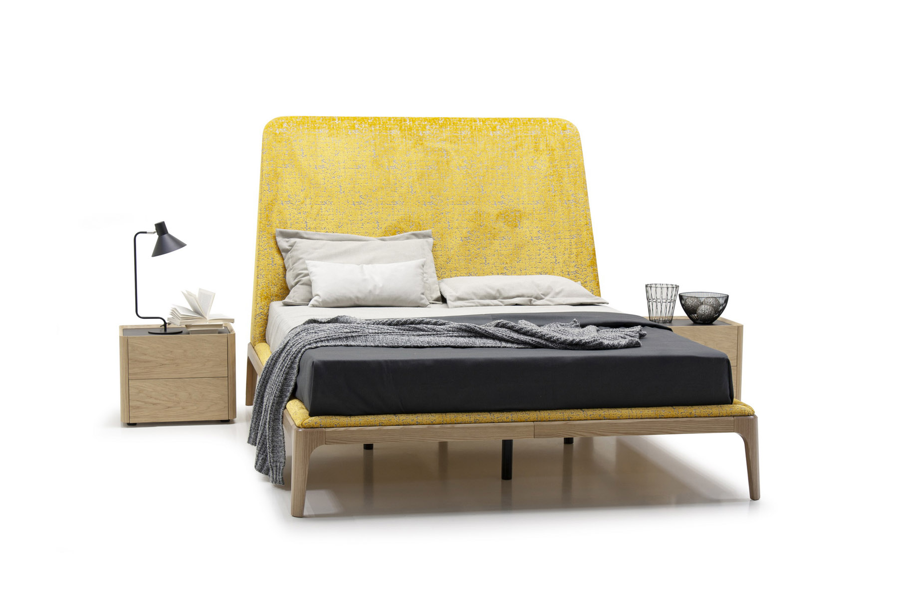 Цвет обивки и текстуру ткани вы можете выбрать на свой вкус. Основание изготавливается из натурального массива ясеня или березы. Высота кровати 142 см.