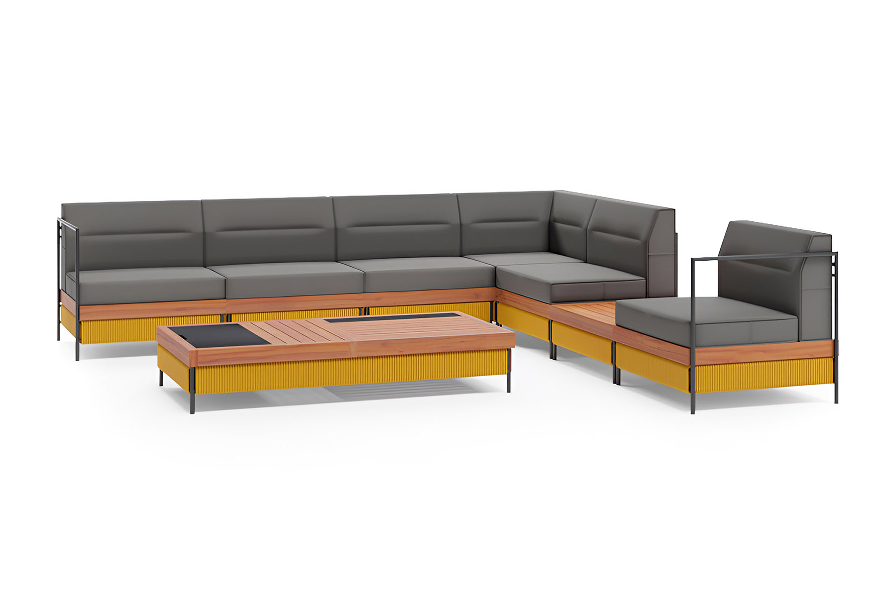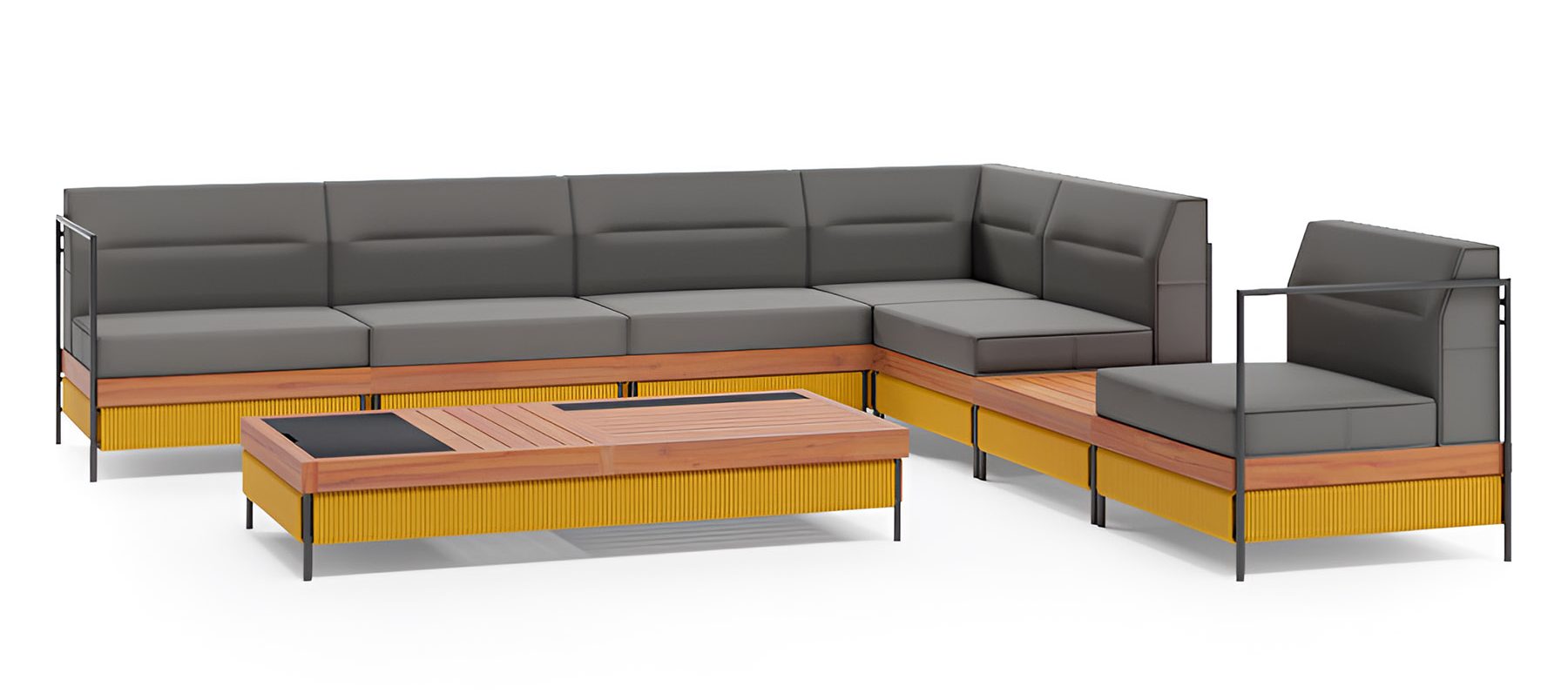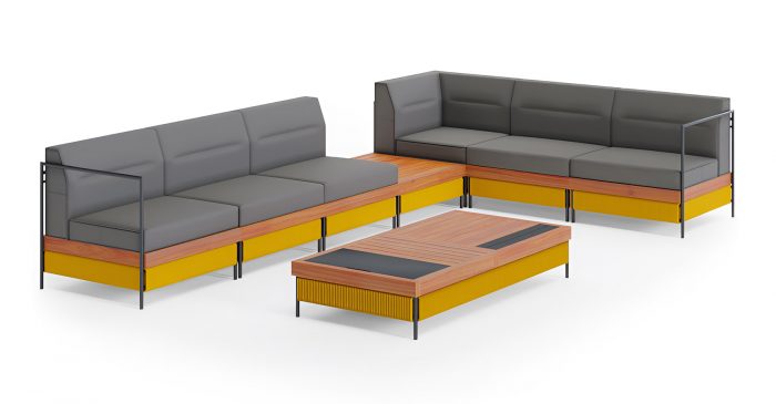 В базовый комплект входят 7 модулей и прямоугольный кофейный стол. При желании его можно дополнить креслом из той же серии или собрать индивидуальную конфигурацию дивана, комбинируя основные, угловые, боковые модули и деревянный модуль-стол.