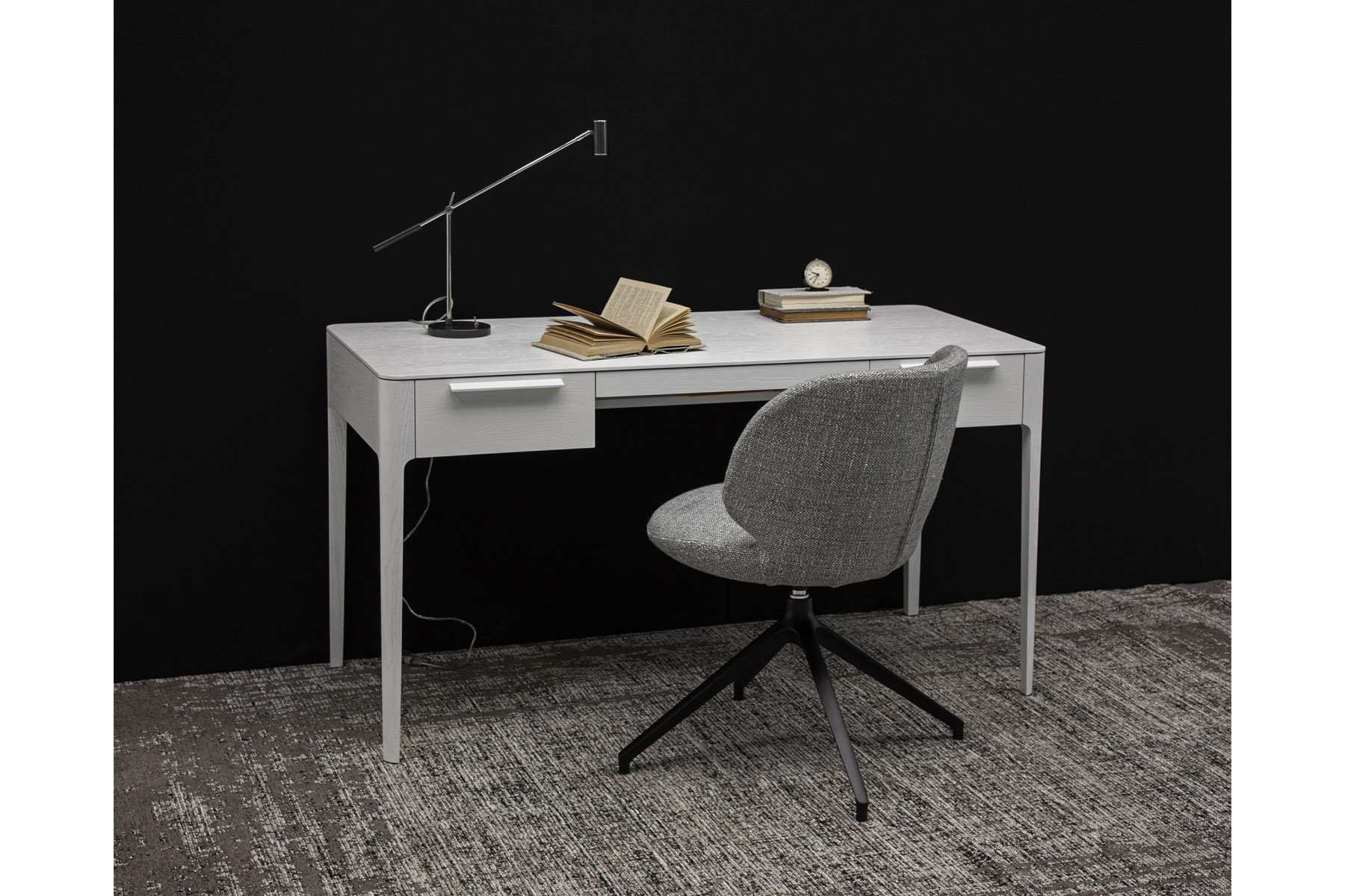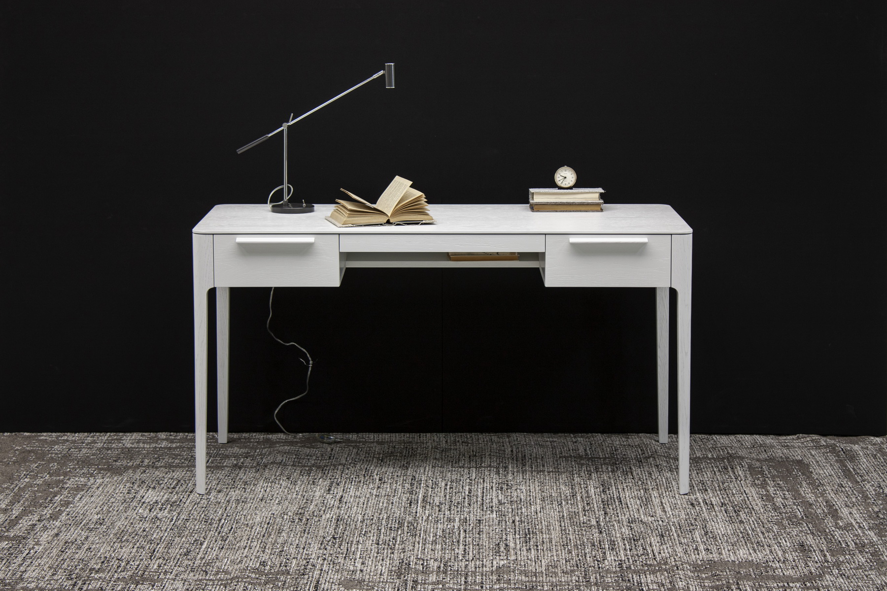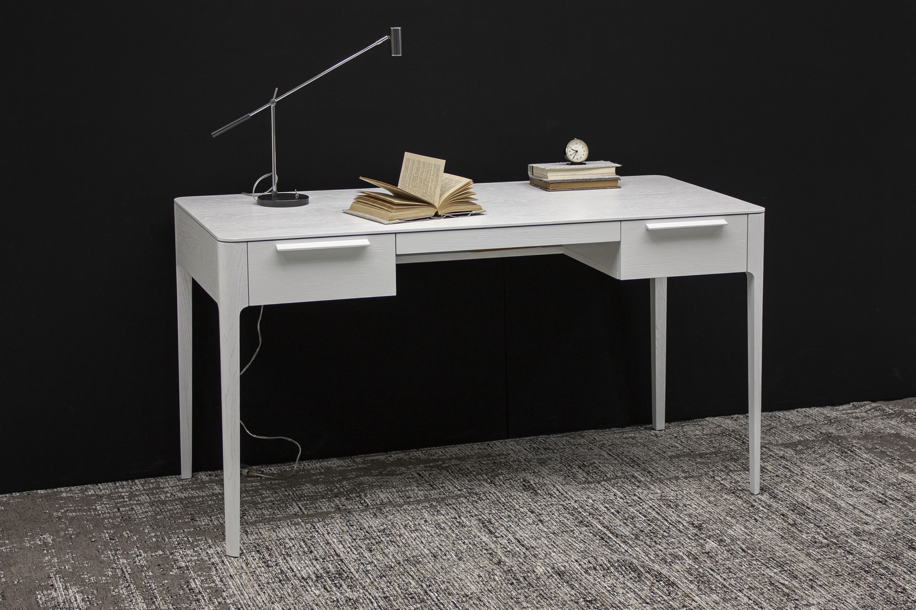 Отличительные особенности конструкции стола — изящные опоры и тщательно проработанные линии, создающие ощущение легкости и эстетической простоты. Бесшумная фурнитура позволяет плавно и тихо открывать ящики, что обеспечивает комфорт в использовании. Доступен выбор цветового решения, чтобы стол идеально гармонировал с окружающим пространством.
