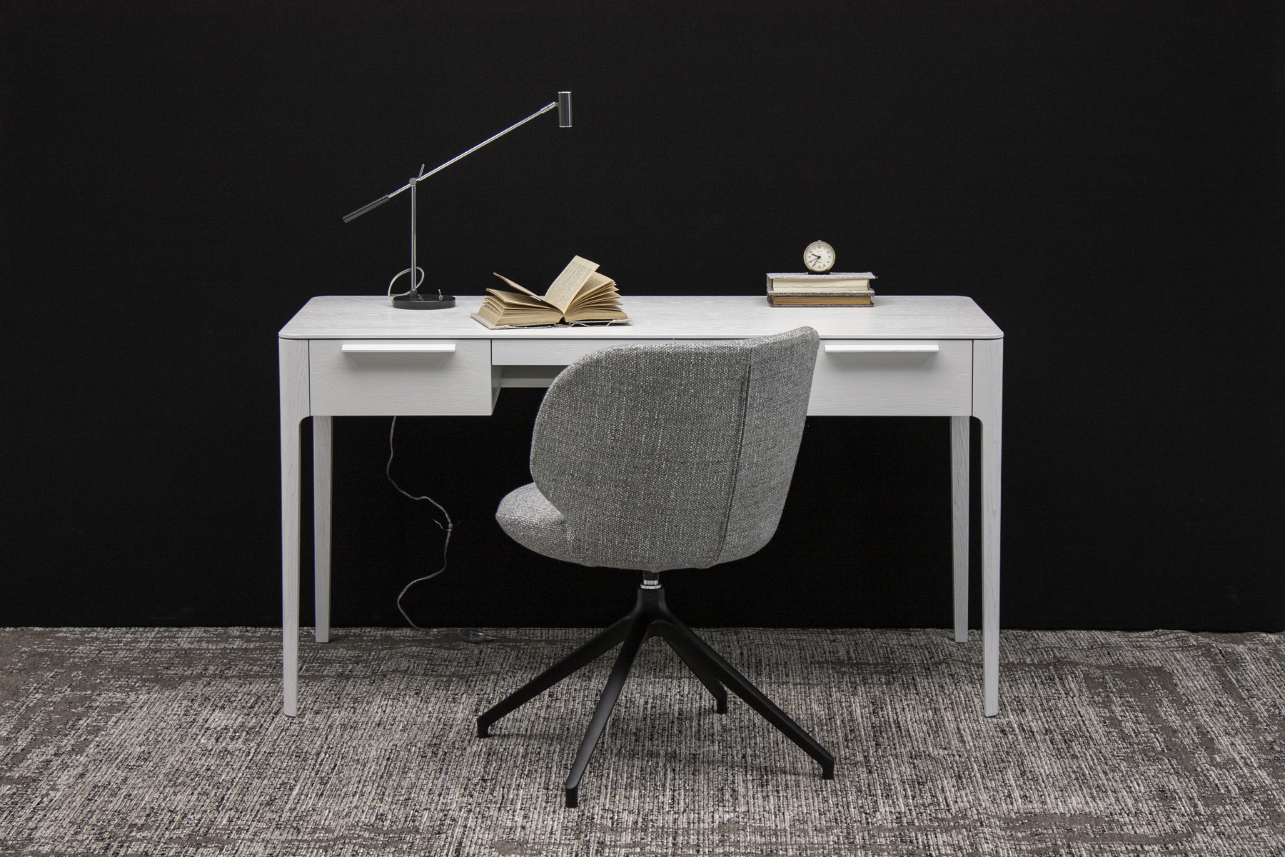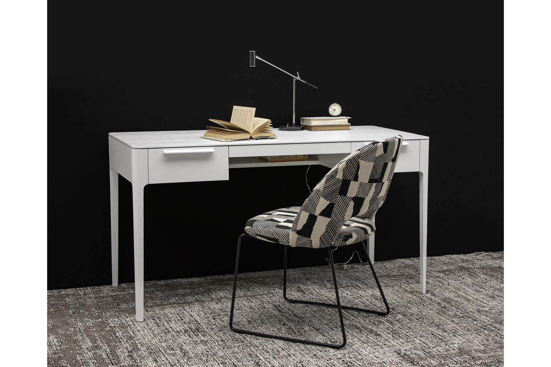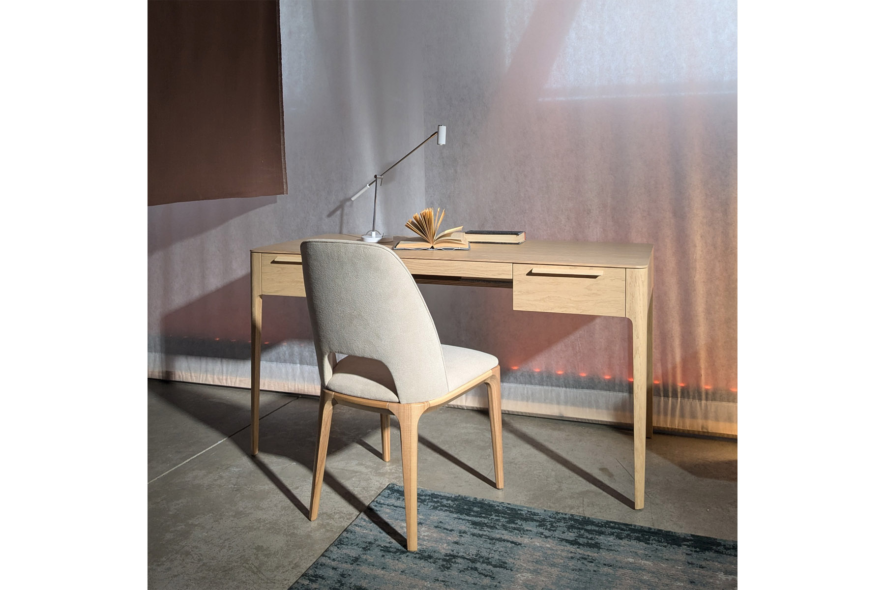 Отличительные особенности конструкции стола — изящные опоры и тщательно проработанные линии, создающие ощущение легкости и эстетической простоты. Бесшумная фурнитура позволяет плавно и тихо открывать ящики, что обеспечивает комфорт в использовании. Доступен выбор цветового решения, чтобы стол идеально гармонировал с окружающим пространством.