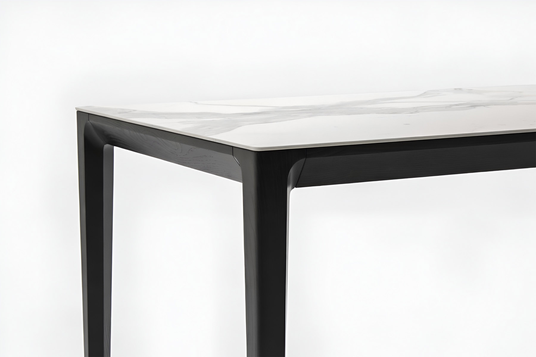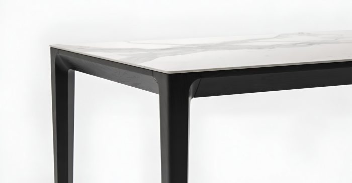 Конструкция стола включает тонкую скошенную столешницу, усиленную металлическим каркасом, что обеспечивает долговечность и прочность. Текстура массива ясеня на опорах и каркасе, добавляет натуральности и тепла, создавая ощущение природной гармонии. Стол доступен в длине до 2,75 метра, что позволяет удобно разместить до 12 человек. Благодаря этому Demy идеально подходит для больших семейных встреч или торжественных ужинов.