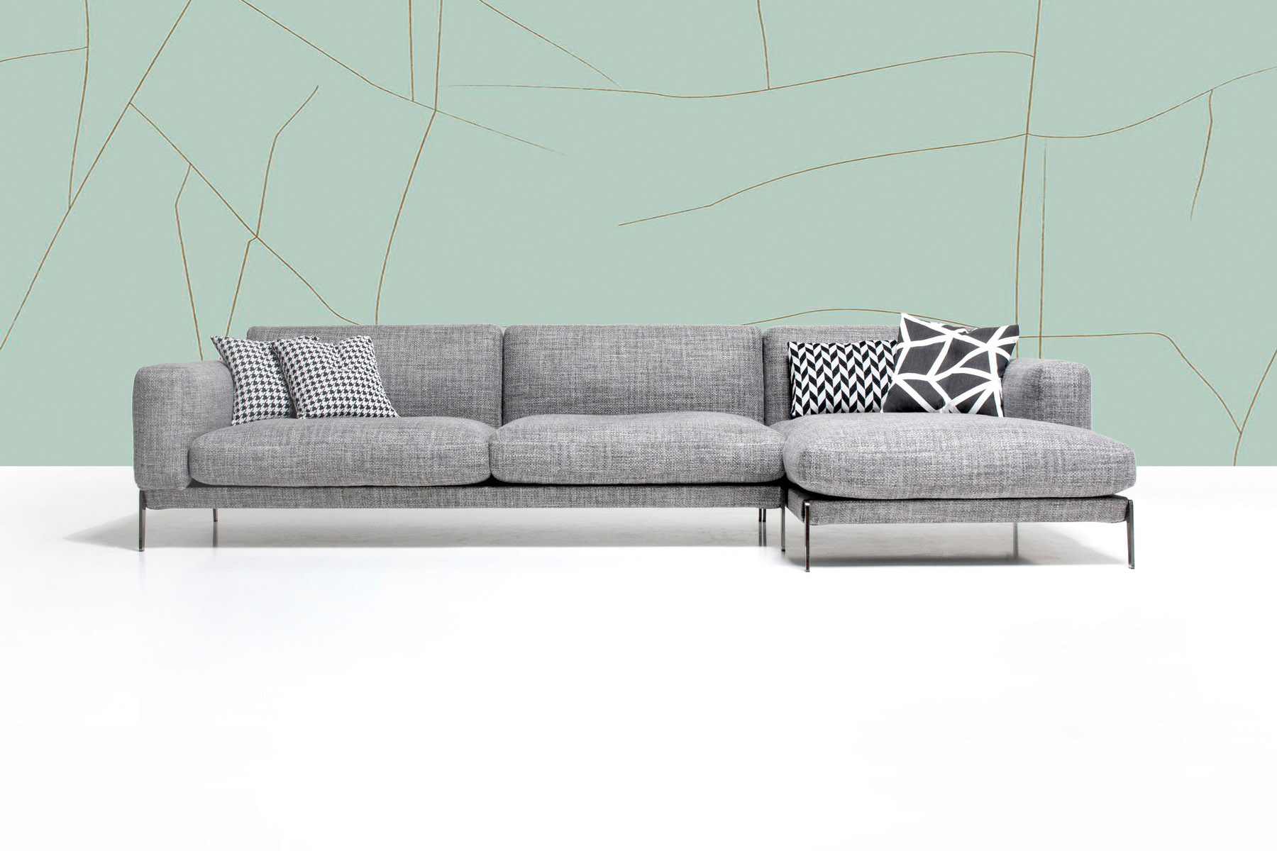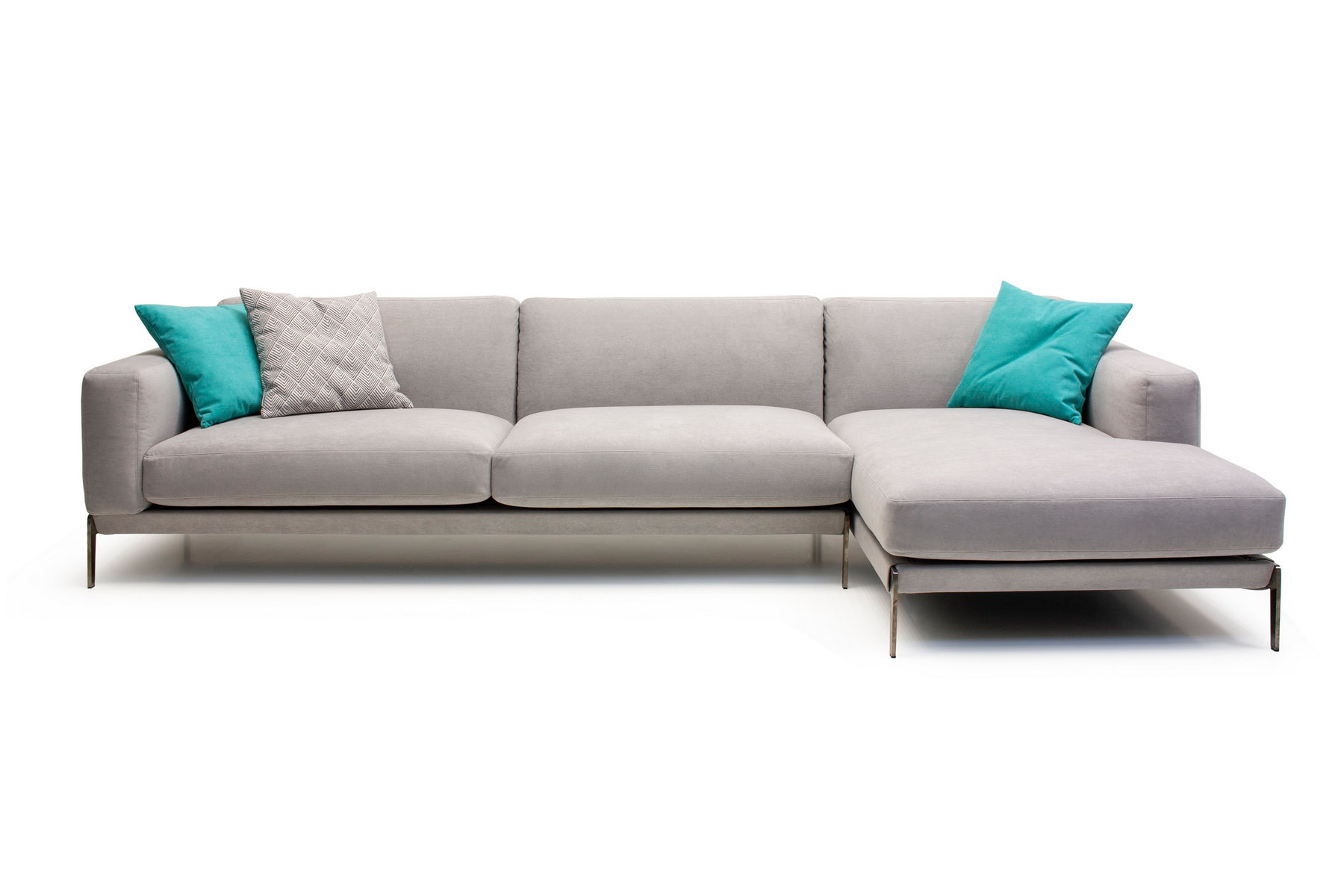 Диван смотрится органично при дневном и искусственном освещении. Утонченные металлические опоры придают дивану выразительность и эстетично гармонируют с теплотой и мягкостью подушек. Сидение и спинка из высокоэластичного пенополиуретана делает опыт использования мебели особенным. Подходящая под ваш интерьер обивка из ткани или кожи завершит композицию.