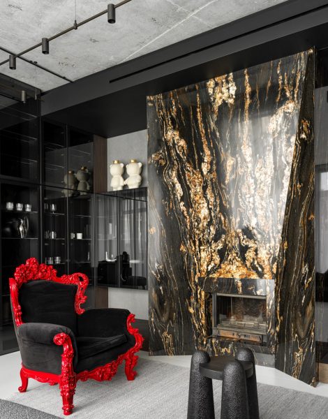 Черный потолок, дубовый шпон, камин с золотыми прожилками и дизайнерская мебель создают современное пространство с художественным характером