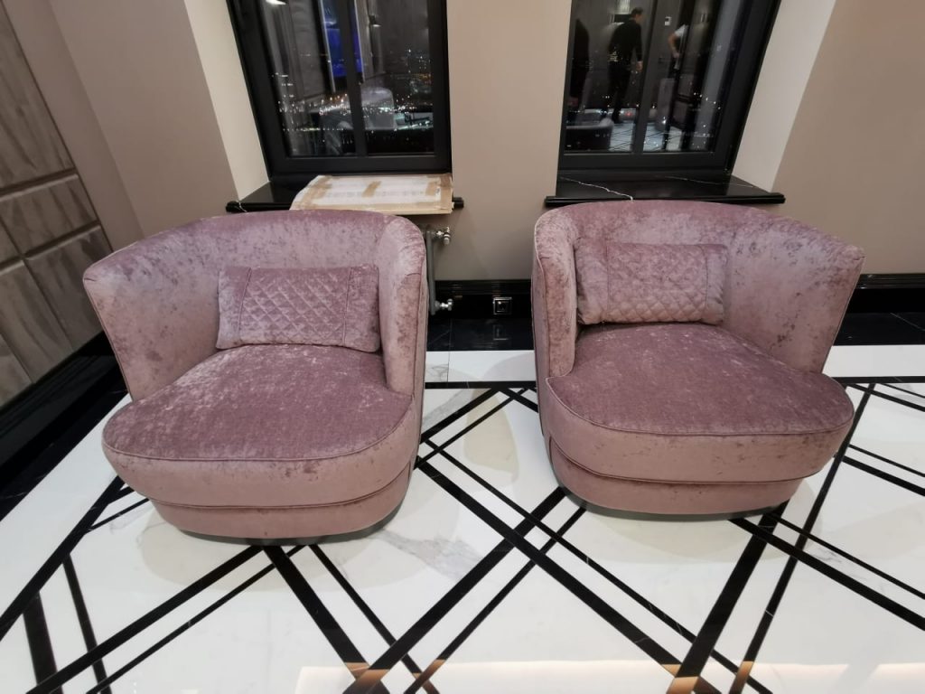 По визуализации стало видно, что некоторые модели кресел — это наши стандартные модели Джаз (для гостиной) и Ромео (для столовой). Для кресел Ромео добавили прострочку по спинке по эскизу клиента и металлические наконечники на ножки.