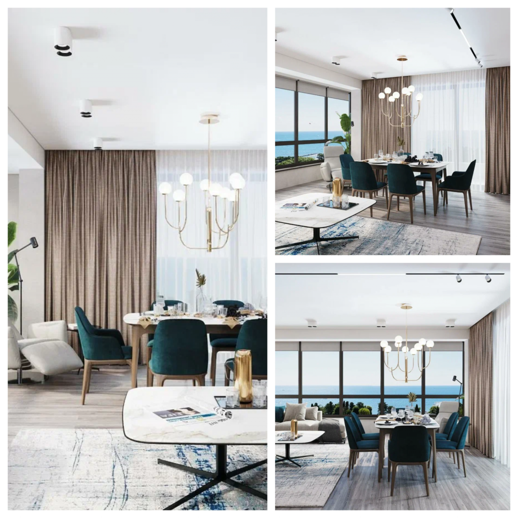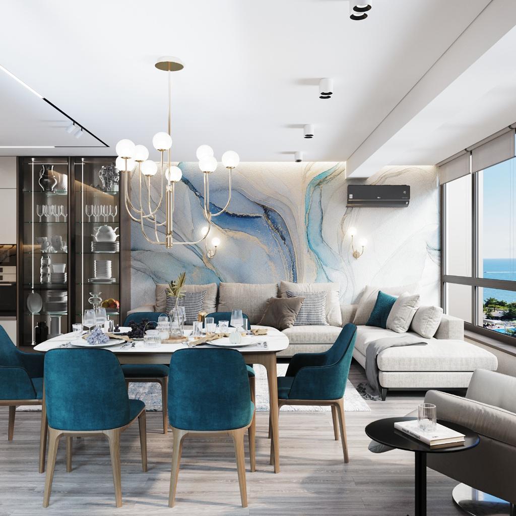 Для обивки стульев была выбрана ткань велюр изумрудного цвета, который перекликается с отделкой стен и видом моря из окна,